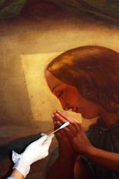 Le vernis ancien est allégé de manière sélective : plus poussé dans les zones où les blancs et les tons clairs dominent, moins prononcé dans les zones d'ombres et là où les teintes sont plus foncées.